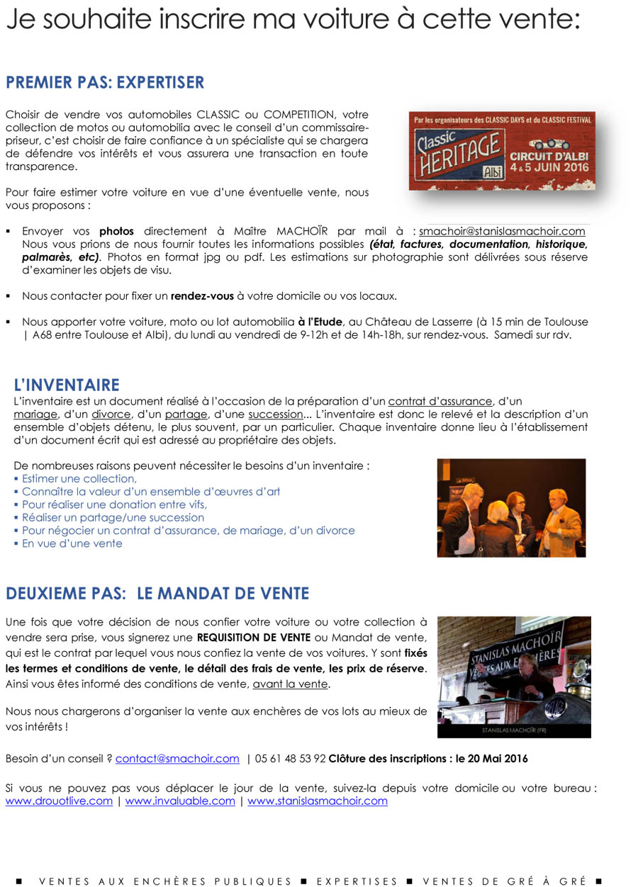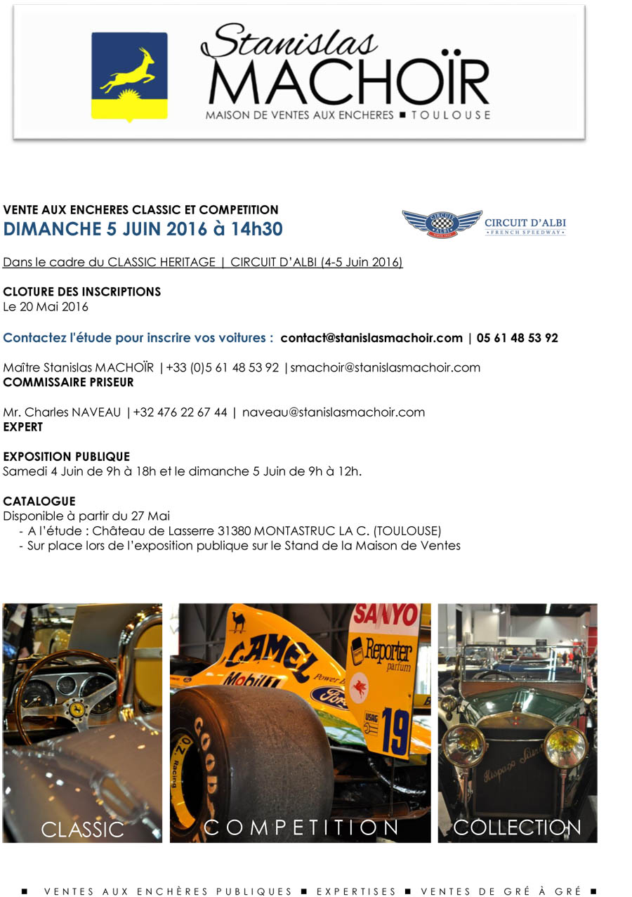 Etant donné la nature de cette vente (Circuit d’Albi), les voitures vendues seront rapatriées des lundi 6 Juin à partir de 9h du matin au Château de Lasserre (31380), au Showroom de la SVV STANISLAS MACHOÏR. Les frais de manutention et transport sont à la charge exclusive de l’acquéreur et à hauteur de 70€HT.